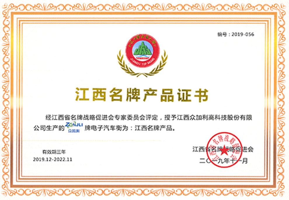 江西眾加利高科技股份有限公司汽車衡被授予江西名牌產品