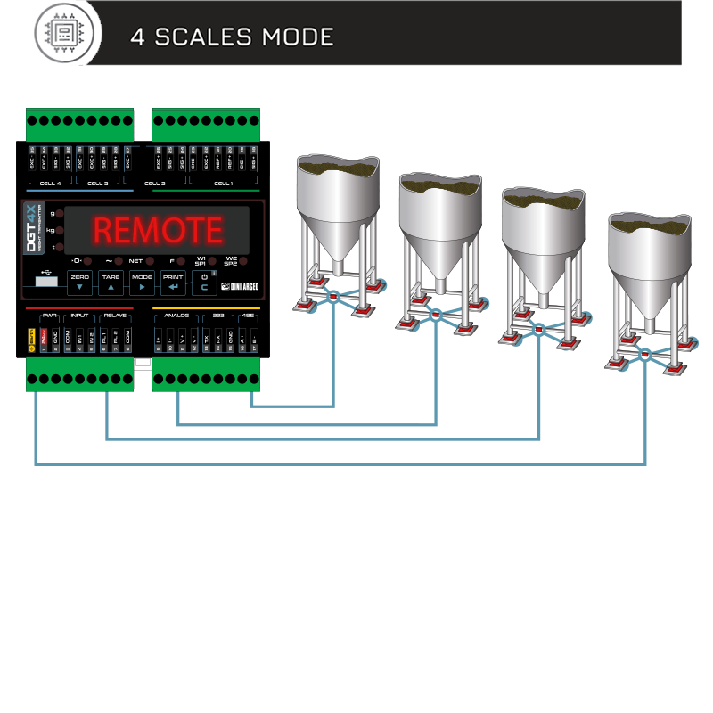 Power supply: 12-24Vdc Converter: A/D 24 bit with 4 channel Max scale number: 4 Load cells connection: 4 or 6 wires (with sense) Operating modes: - Digital junction box - Multi-scale transmitter - Single-scale transmitter